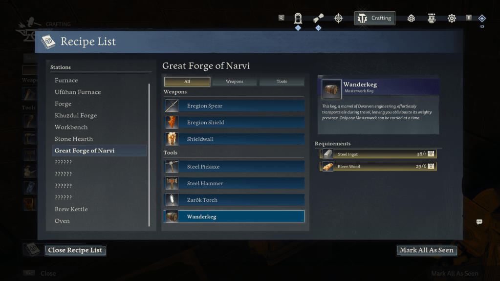 Otherwise, take your resources and head to the Great Forge of Narvi where you can craft the Wanderkeg.