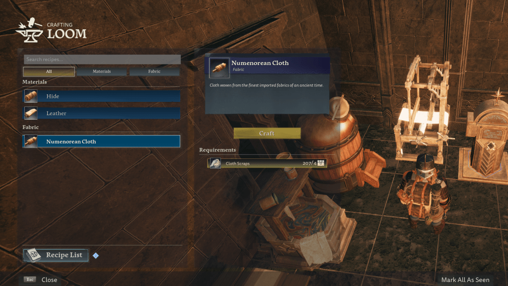 To unlock Numenorean Cloth, you’ll need to build the loom.